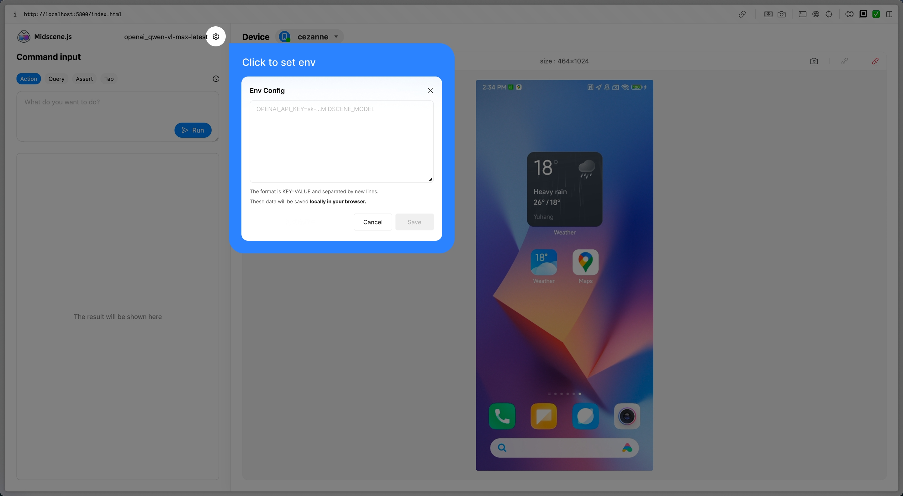 Playground 是验证连接、观察 AI Agent 的最快方式,无需编写代码。它与 @midscene/android 共享相同的代码实现,因此在 Playground 上验证通过的流程,用脚本运行时也完全一致。